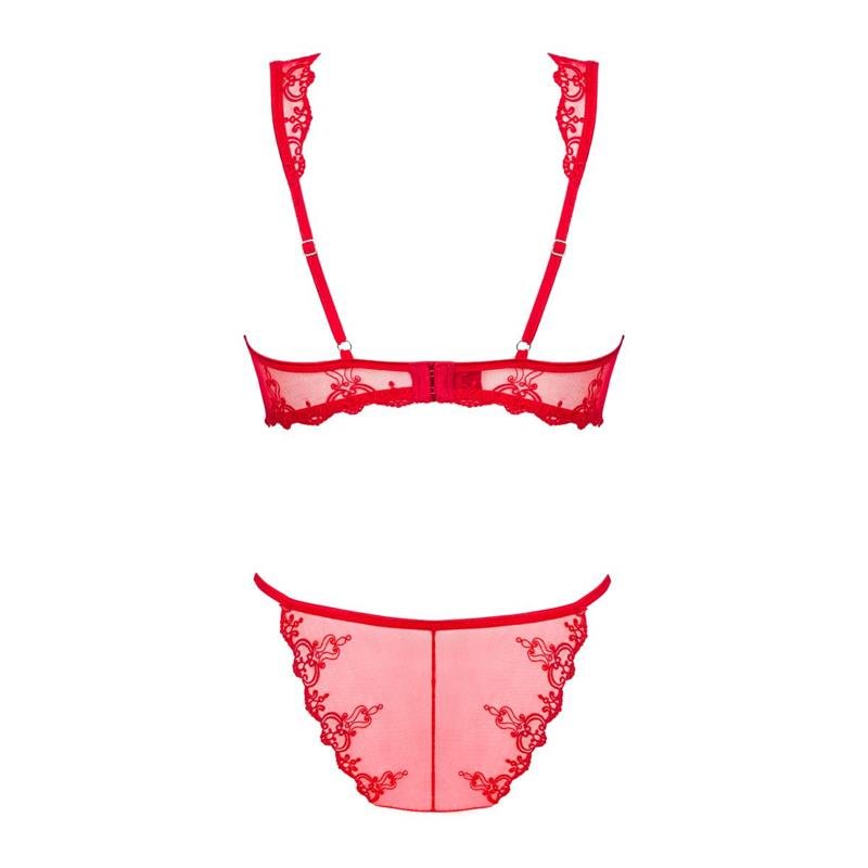 Este conjunto de 2 piezas en un tono rojo seductor tiene hermosos detalles de encaje y es cómodo de llevar gracias al material elástico. El conjunto se compone de un sujetador con aros y un tanga sexy a juego. Los tirantes de los hombros son fácilmente ajustables para un buen ajuste.