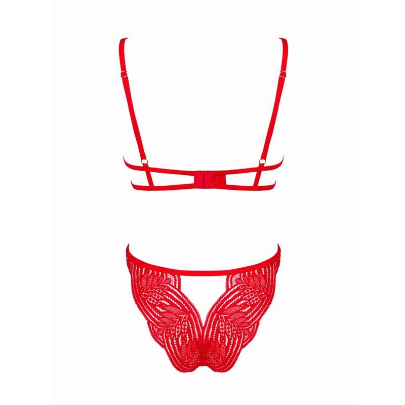 Siéntete sexy y segura con este hermoso conjunto Mellania en un tono rojo romántico. El conjunto incluye un sujetador con las copas entreabiertas y un tanga sexy a juego. El material es elástico para un ajuste cómodo.