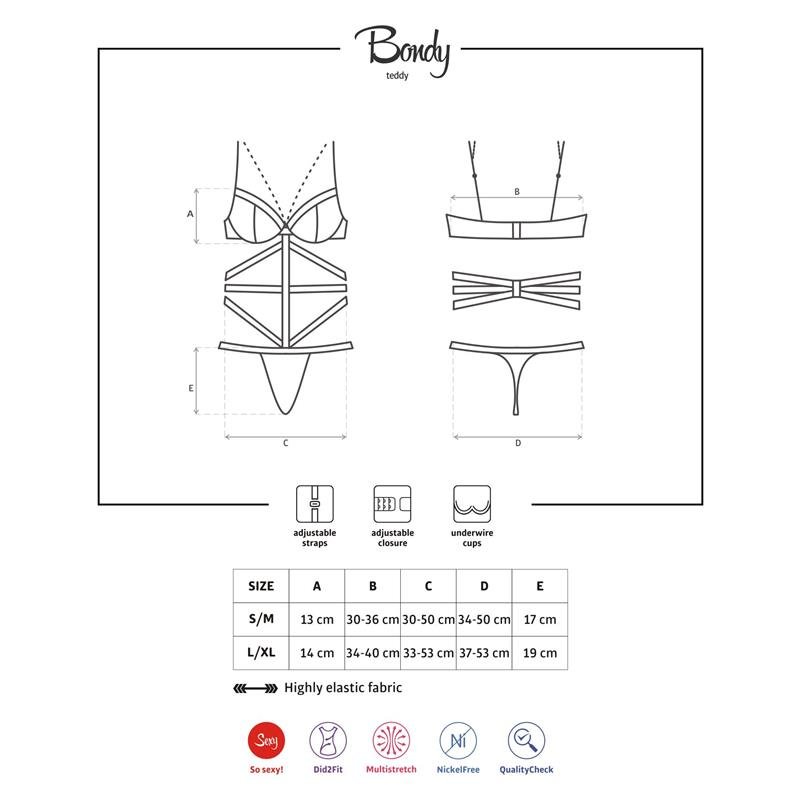 Sensual body de malla semi transparente con una variedad de tiras que abrazan tu cuerpo. Cuenta con tirantes ajustables y un elegante collar que va desde el pecho hasta el cuello.